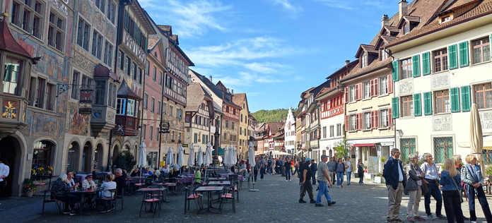 We then started off towards the northern boundaries of Switzerland towards the medieval village of Stein am Rhine. This well preserved town gave us a look into the 13th and 14th century half-timbered houses with their skilfully painted facades. A stroll around this place, situated on the banks of river Rhine, is like a walk in an art museum.